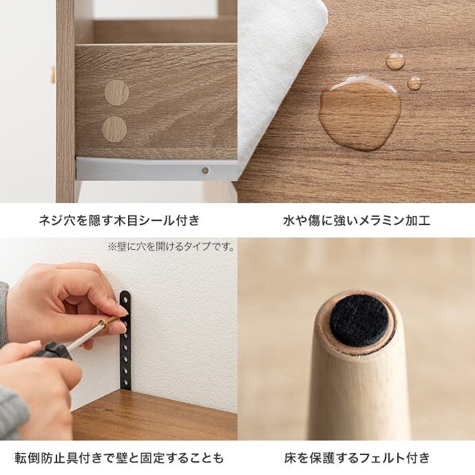 木の温かみを感じるリアルな木目調とゴールドのあしらいが目を惹く『Lucas(リュカ)』シリーズのチェスト。ワイドな引き出しは4段に分かれており、段毎に整理しながらこの1台にたっぷり収納していただけます。引き出しは簡単に取り外すことができるため中身はそのままで入れ替えることができ、衣替えをする時などに大変便利です。また、コンパクトなスリム設計のため圧迫感がなく、一人暮らしやワンルームにもぴったりなサイズ感に仕上げました。
