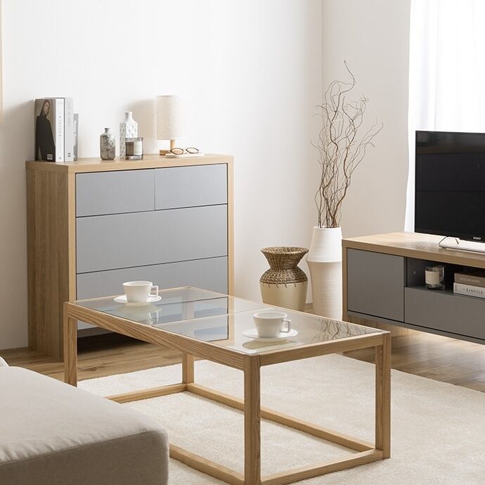 木目×グレーで王道の北欧スタイルを叶える『Alskar(アルスカー)』シリーズのチェスト。余計な装飾の無いシンプルなフォルムと、外側からネジ穴が見えないノイズレスデザインです。コンパクトサイズながらも収納力抜群で、一人暮らしやワンルームにもピッタリです。