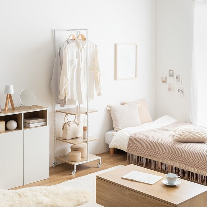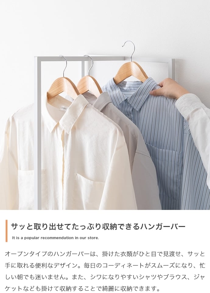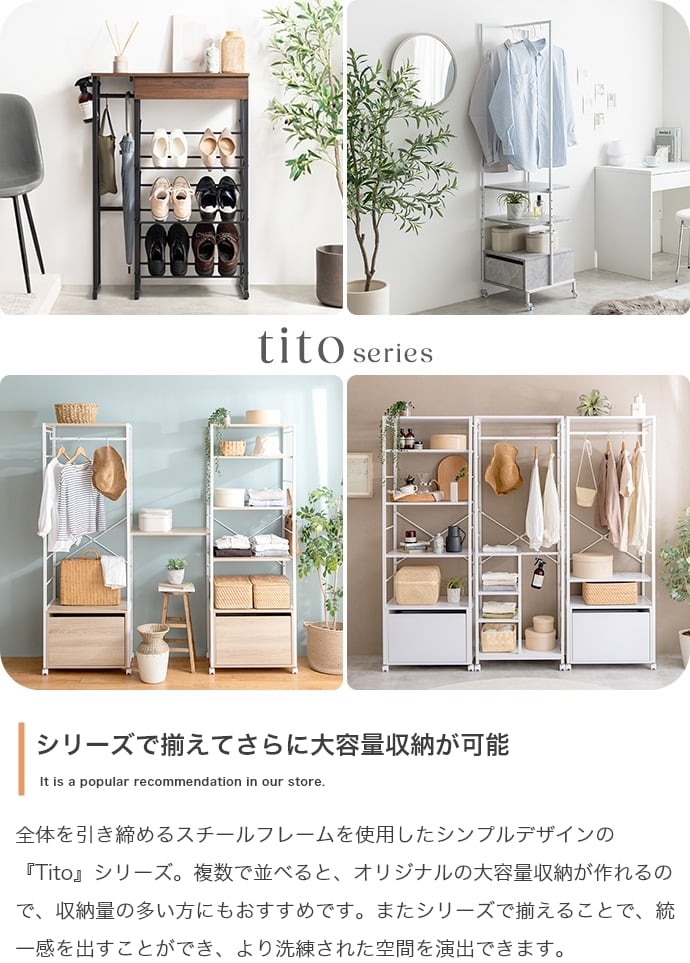 スリムなのに服と鞄をしっかり収納できる『Tito(ティート)』シリーズのハンガーラック。掛けると置くを両立でき、自分好みの収納スペースが実現します。7段階で動く可動棚と引き出し、ハンガーバーは服と鞄をひとまとめに収納することができ、ショート丈からロング丈までたっぷり収納可能。また、スリムなコンパクトサイズのため、一人暮らしや限られたスペースに置きたい方にもおすすめです。
