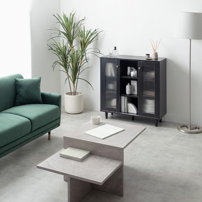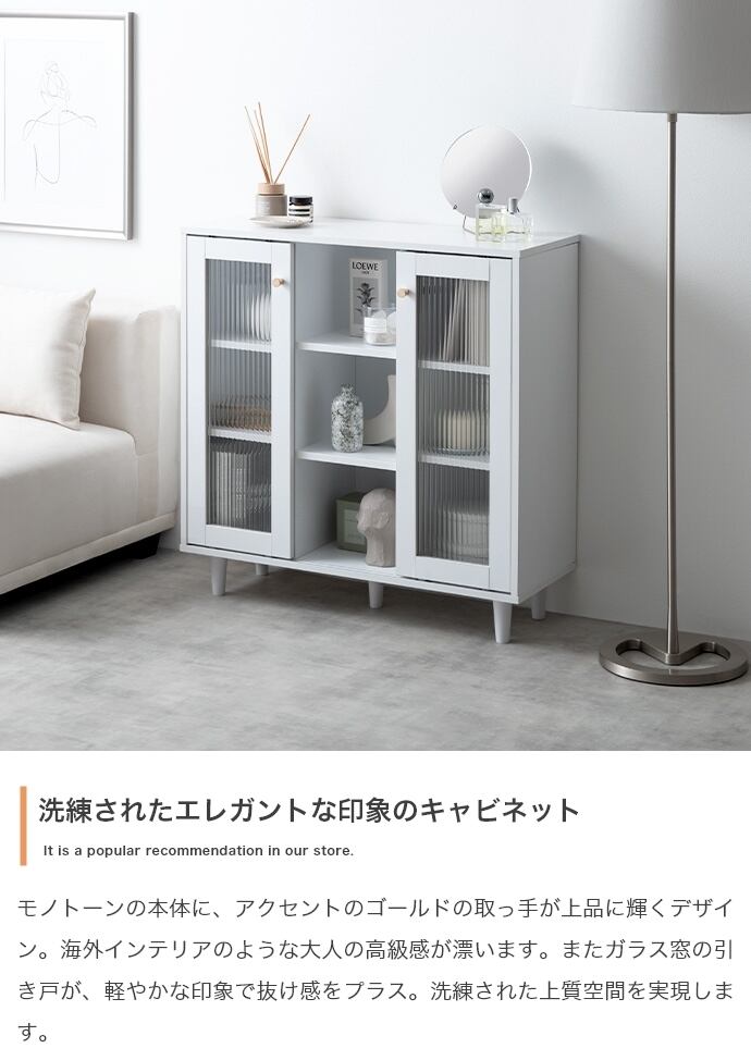 コンパクトながら機能性と美しさを兼ね備えた『Sonagi(ソナギ)』引き戸キャビネット。扉は引き戸式のため、スライドすることで見せると隠すが使い分けられます。扉のモールガラスが収納物を程よく隠すため、生活感を抑えて軽やかな空間を演出。モノトーンの本体とゴールドの取っ手が上品で、置くだけで海外インテリアのような上質な空間を実現します。