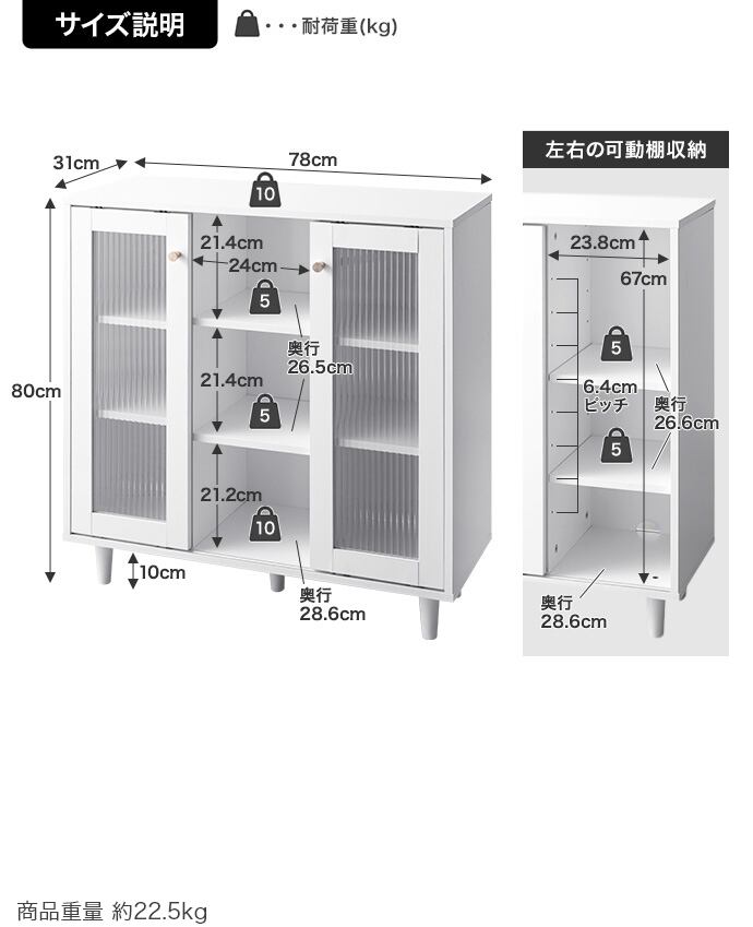【耐荷重】天板:約10kg、中央収納棚:各約5kg、左右収納可動棚:各約5kg、底板:約10kg