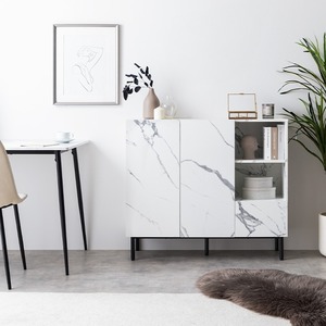大理石柄の美しさが際立つ『Ellis(エリス)』シリーズのキャビネット。直線的なフラットデザインで、置くだけで落ち着いた大人な空間を演出します。また3列の収納スペースにより、本や書類、小物やルーターなどリビングで散らかりがちな物をまとめて収納可能。スリムながら沢山収納できるため、すっきりとしたお部屋作りが叶います。デザインも収納力も妥協したくない方にぴったりのキャビネットです。