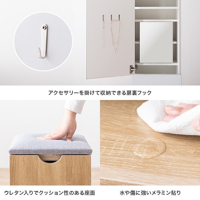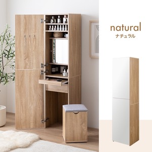 ミラーも収納もドレッサーも、省スペースで叶える『Choa(チョア)』姿見ドレッサー。扉を閉じれば全身ミラー、開ければ大容量収納付きのメイクスペースに早変わり。鏡裏やスツール内など見えない場所にもたっぷり収納を備え、コスメはもちろんアイロンなどの美容家電もすっきり収納いただけます。さらに引き出しとスライドテーブル付きで、道具を広げても快適に使える設計。毎日のメイクを心地よく整える、こだわりの1台です。