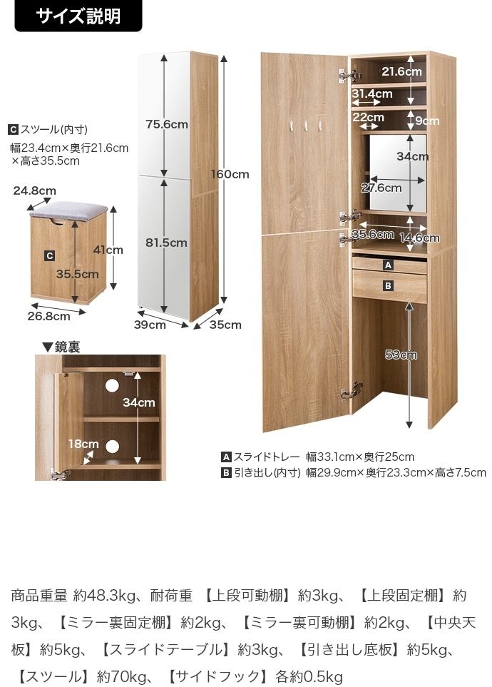 【耐荷重】上段可動棚:約3kg、上段固定棚:約3kg、ミラー裏固定棚:約2kg、ミラー裏可動棚:約2kg