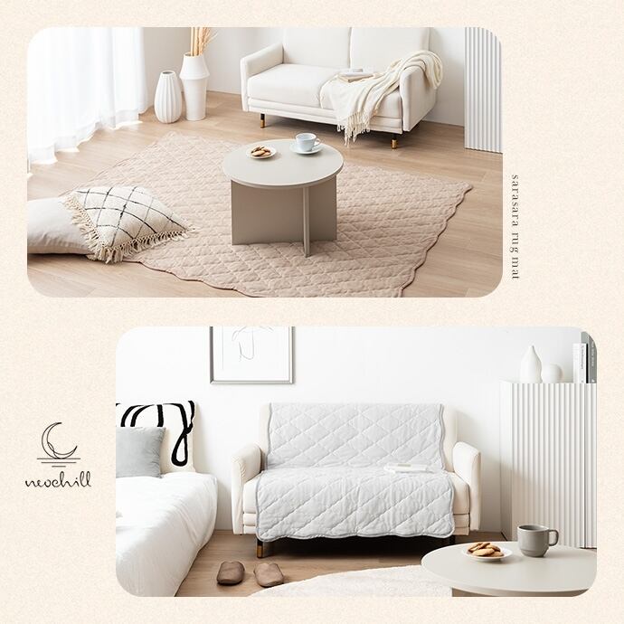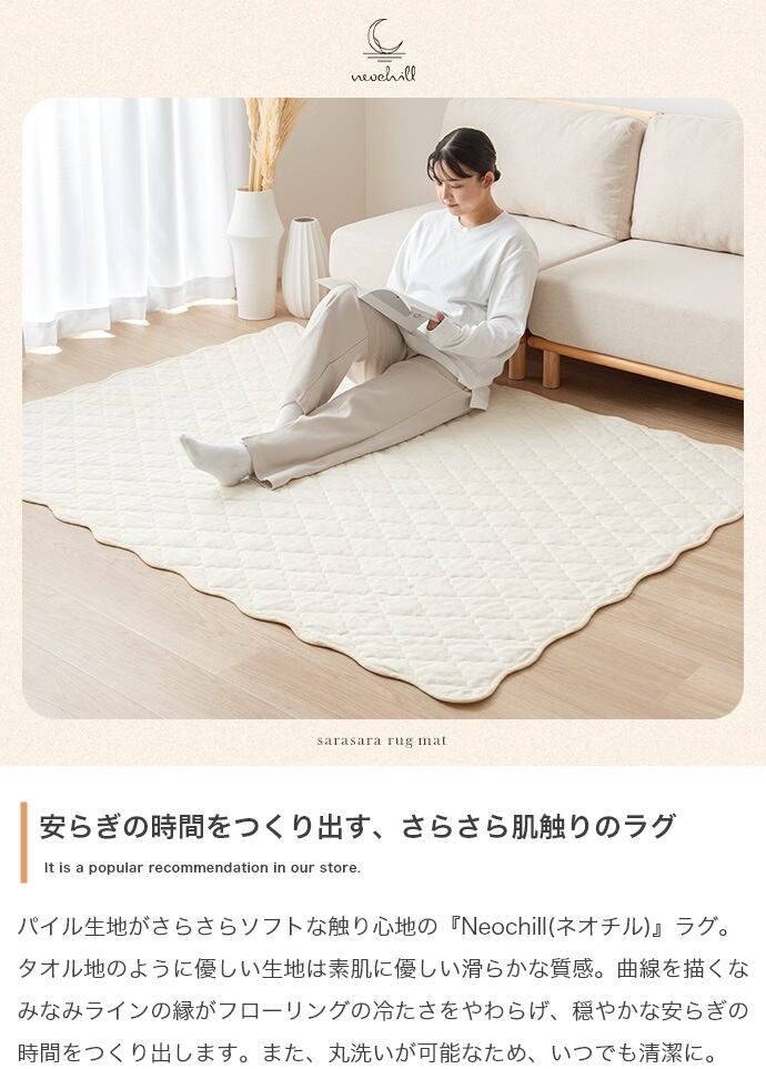 パイル地がさらさらソフトな触り心地の『Neochill(ネオチル)』ラグ。タオル地のように優しい生地は素肌に優しい滑らかな質感。曲線を描くなみなみラインの縁がフローリングの冷たさをやわらげ、穏やかな安らぎの時間をつくり出します。また、薄手タイプのためラグとしてだけではなく、ソファカバーやベッドカバーなどマルチカバーとしても大活躍。裏地には滑り止めも付いているためずれるストレスもありません。さらにラグは手洗いで丸洗いが可能なため、いつでも清潔にお使いいただけます。