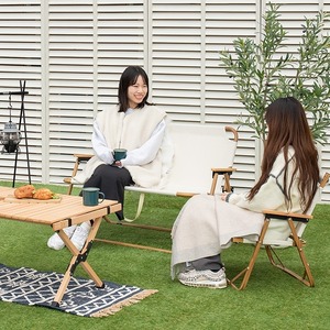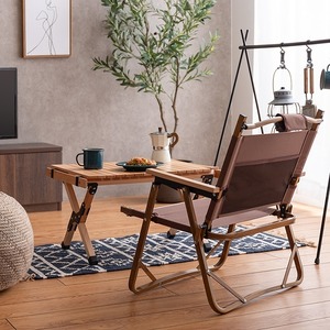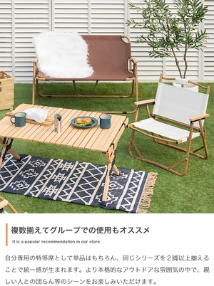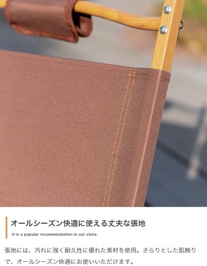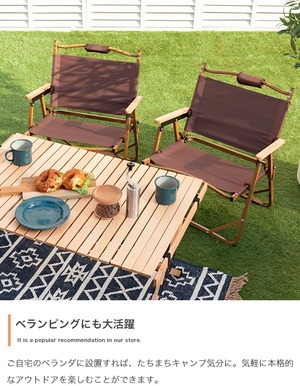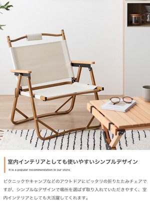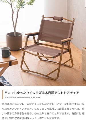 木目調のアルミフレームと天然木のアームレストがナチュラルな雰囲気を演出する、折りたたみアウトドアチェア