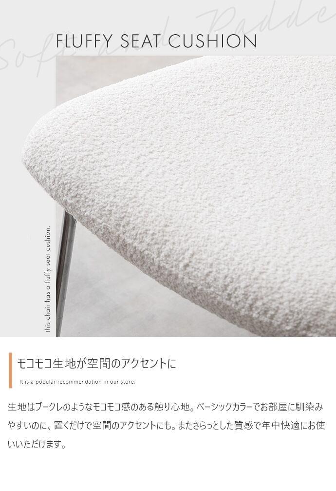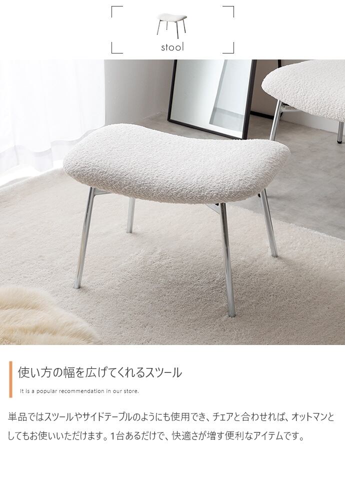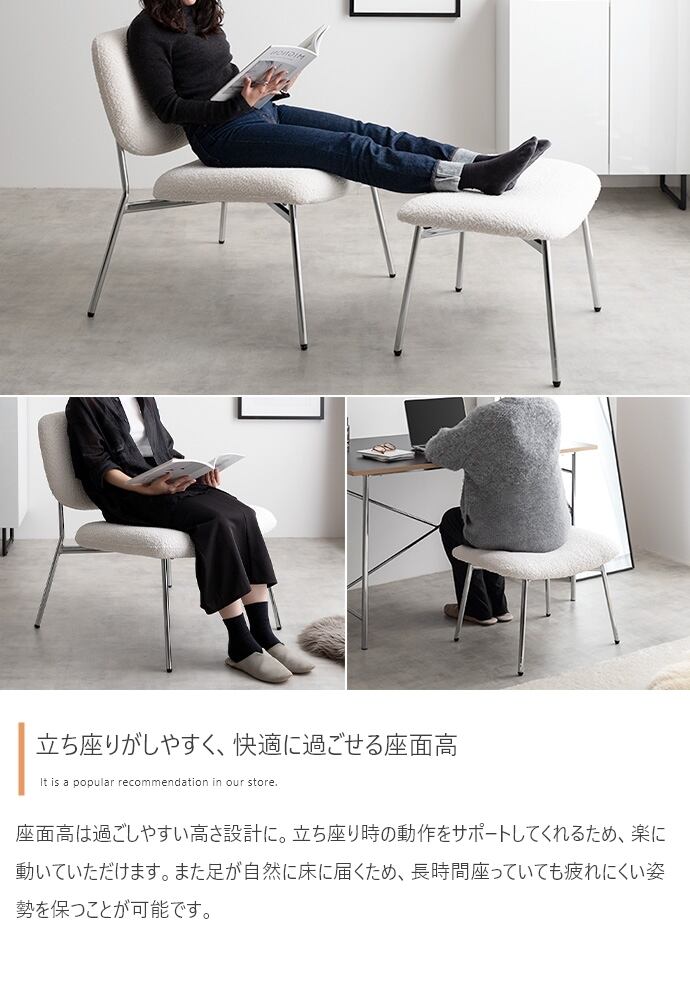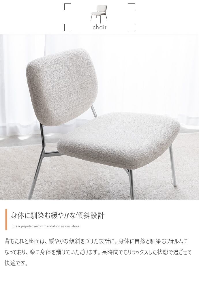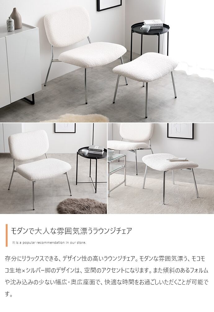 上質な空間でリラックスできる、デザイン性の高いラウンジチェア。モコモコ生地×シルバー脚のデザインは、空間のアクセントになります。また座面は、傾斜のあるフォルムで沈み込みの少ない幅広・奥広設計。デザイン性だけでなく、座り心地も抜群で心地いい時間をお過ごしいただけます。