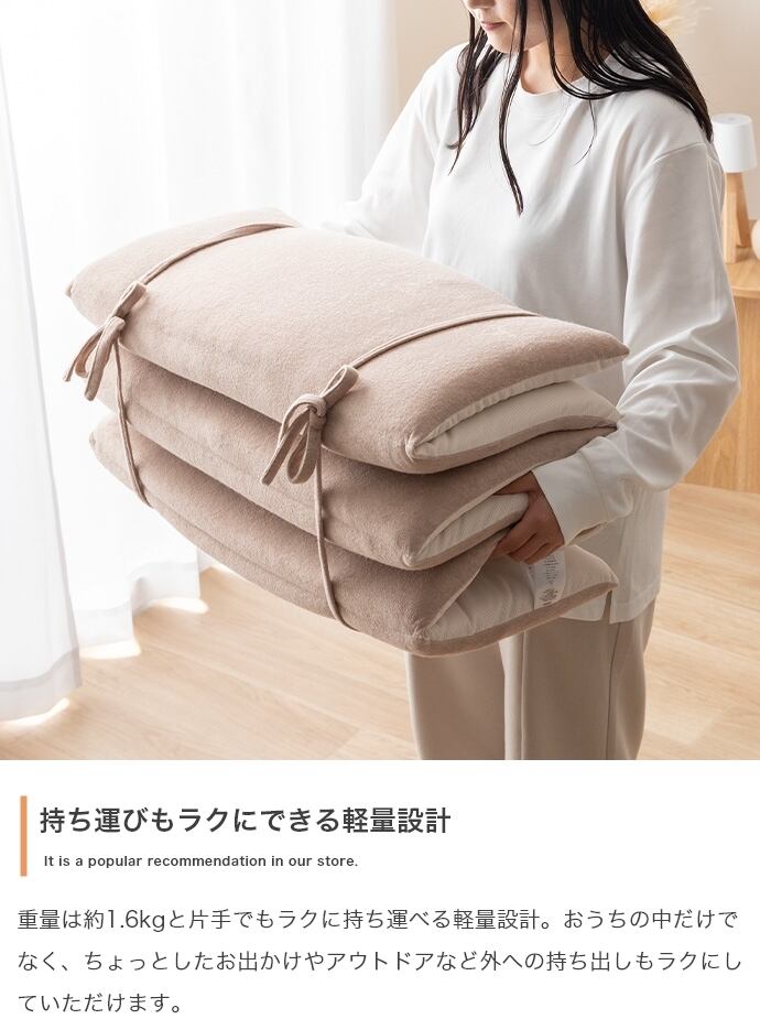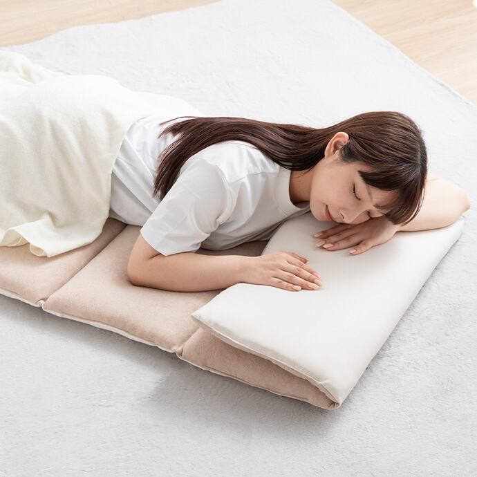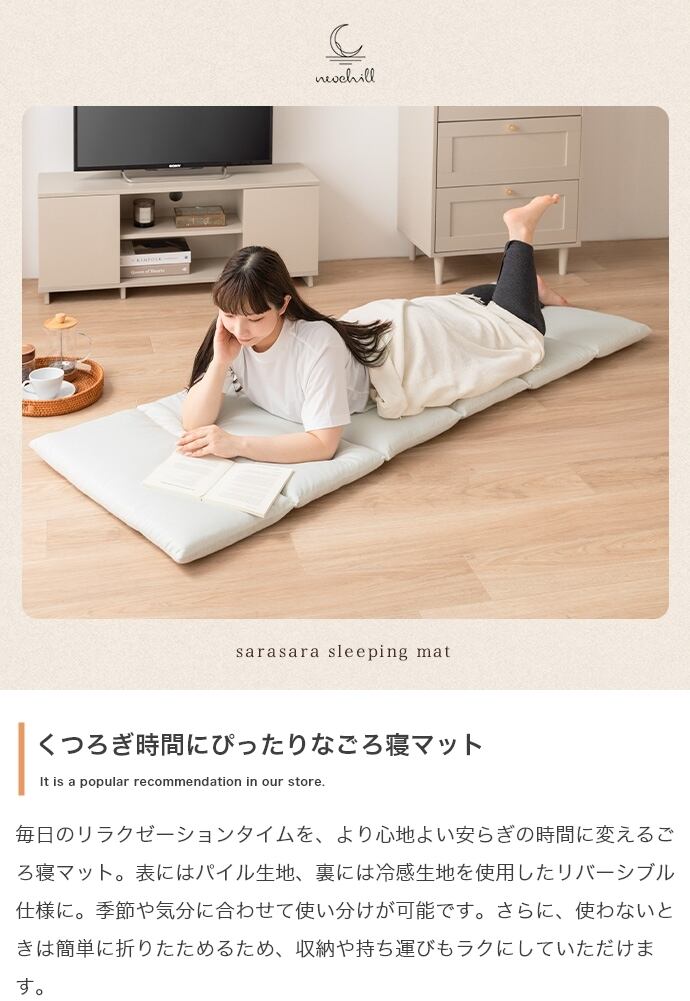 毎日のリラクゼーションタイムを、より心地よい安らぎの時間に変える『Neochill(ネオチル)』シリーズの、sarasaraごろ寝マット。表にはパイル生地、裏には冷感生地を使用したリバーシブル仕様に。季節や気分に合わせて使い分けが可能です。さらに、使わないときは簡単に折りたたむことができ、本体についている紐でコンパクトにまとめられるため、収納や持ち運びもラクにしていただけます。