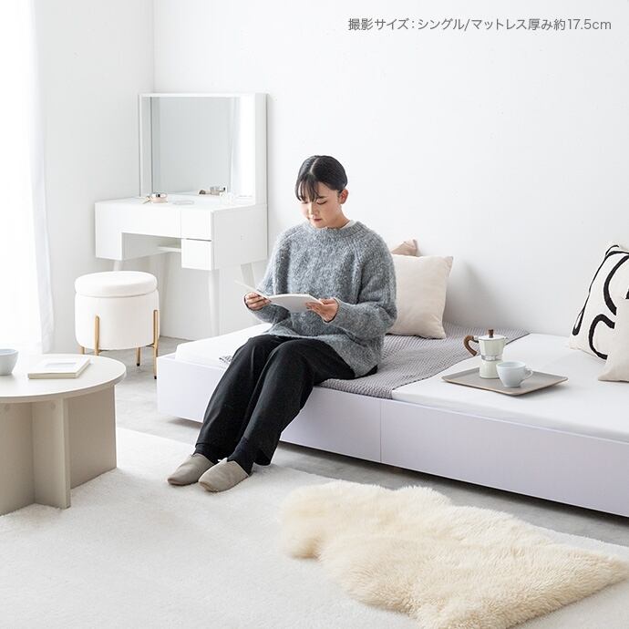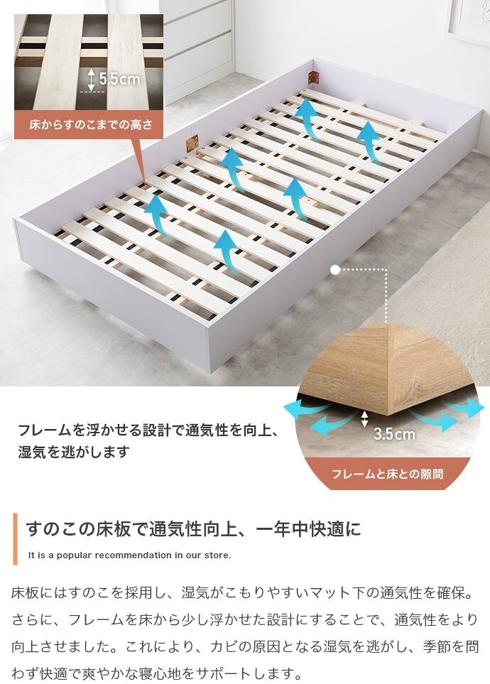 マットレスをフレーム内にすっきり収める「ドロップマット構造」の『Slib(スリーブ)』すのこローベッド。どこから見ても美しいノイズレスデザインのフレームは開放感を演出するロー設計で、空間を広々と見せながら、すのこの床板で通気性も確保。一年中快適に使える、自分だけのリラックス空間を実現します。