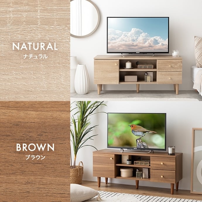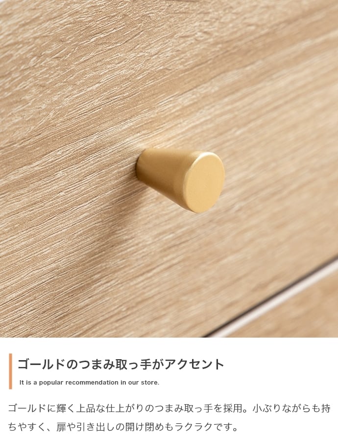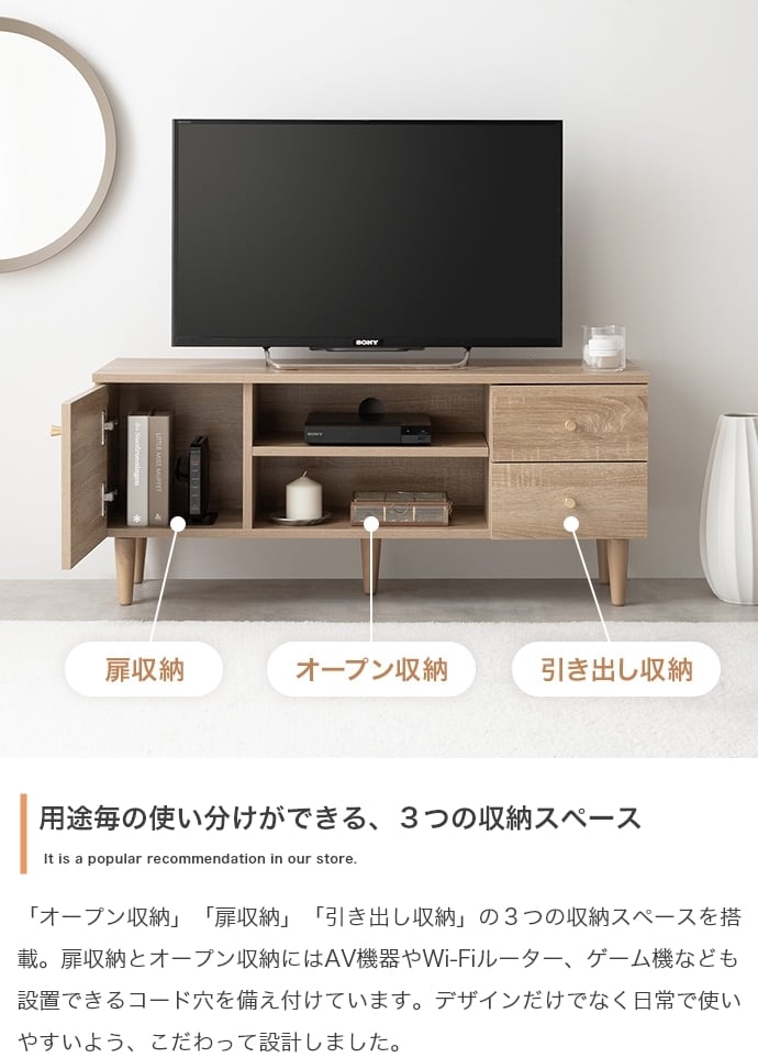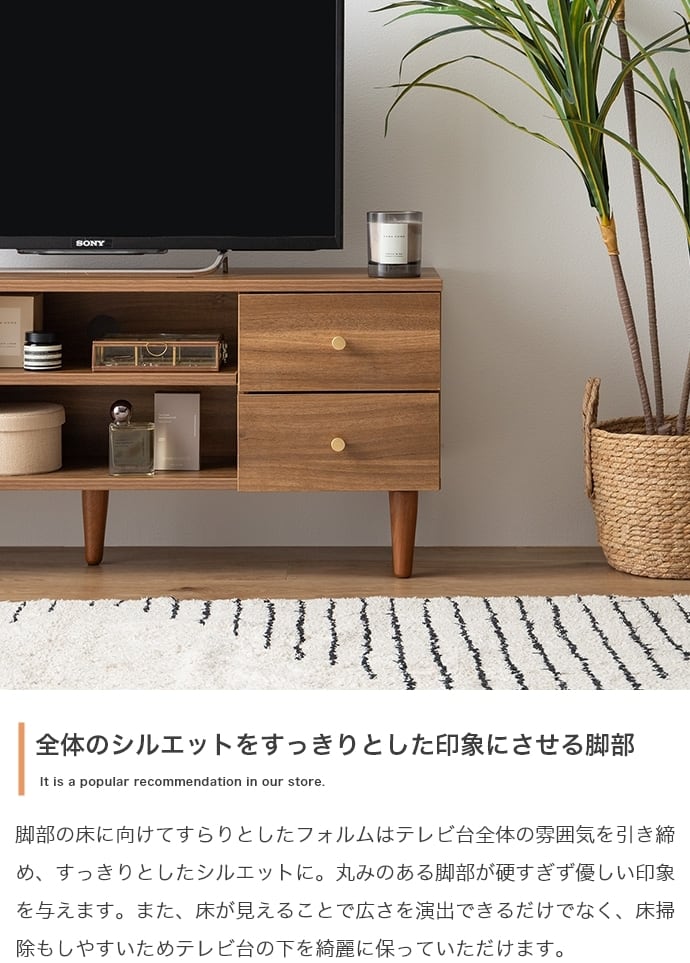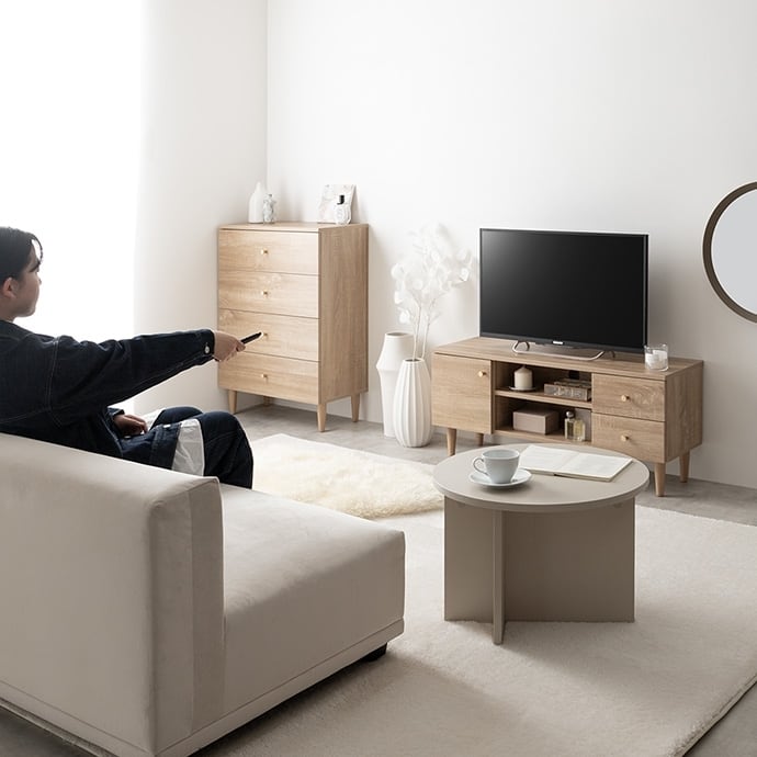 木の温かみを感じるリアルな木目調とゴールドのあしらいが目を惹く『Lucas(リュカ)』シリーズのテレビボード。ワンルームにぴったりのコンパクトサイズながらも充実した3種類の収納スペースにより整理整頓が快適に。背面にはコード穴のほか、配線を逃がすコードスリットやタップ収納を設置。壁にぴったりくっつけられ、すっきり置けるようにこだわりました。デザインも使いやすさも妥協せず、ごちゃつきがちなテレビ周りをスマートに整理できます。