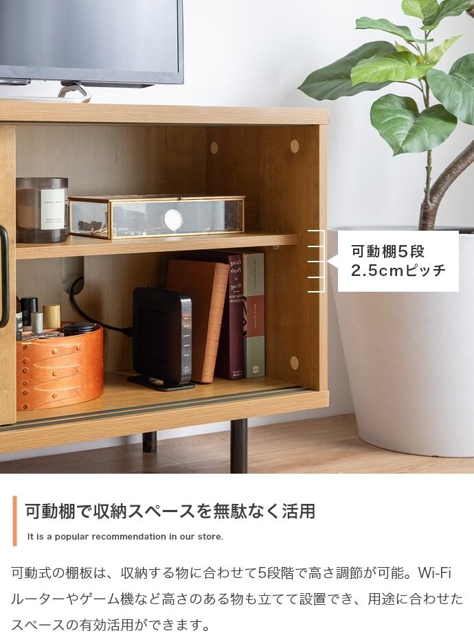 すっきりとした佇まいが、上質な空間をつくり出す『Illumina(イルミナ)』テレビ台。温かみのあるリアルな木目調が、空間に温もりと落ち着きをプラス。また画面が見やすい、少し高めの高さ設計で、リラックスタイムをより快適にお過ごしいただけます。さらに5段階で高さ調節ができる可動棚を備え、AV機器や生活感のある小物類などもまとめて収納。使いやすさとデザイン性を兼ね備えた、暮らしに寄り添う一台です。