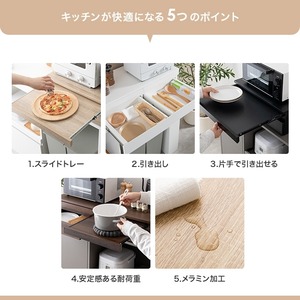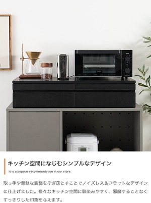 レンジ下を有効的に活用する『Cammy(キャミー)』レンジ下収納。ちょい置きできるスライドトレーとワイドな引き出しで、手狭なキッチンをすっきり整理し快適に。幅50cmタイプと幅80cmタイプの2つのサイズをご用意したため、置きたい場所や用途に合わせお好きな幅をお選びいただけます。また、レンジや炊飯器などキッチン家電の下に省スペースで設置できるため、今の環境を大きく変えないまま、作業効率を大幅アップすることが可能です。