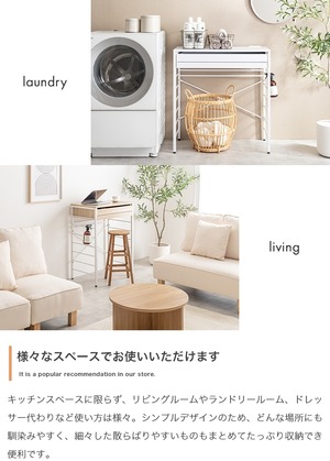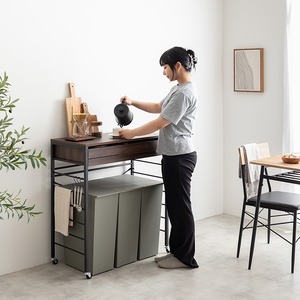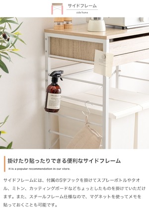 ゴミ箱上のデッドスペースを収納・作業スペースとして有効的に活用する『Cammy(キャミー)』ゴミ箱上レンジラック。ワイドな引き出しとちょい置きできるスライドトレーは、手狭なキッチンをすっきり整理し快適に。また、天板には2口コンセントが付いており、キッチン家電を置くことも可能です。アジャスターとキャスターの部品がどちらも付属しているため、固定も移動もお選びいただけ、用途に合わせてお好きなスタイルでお使いいただけます。